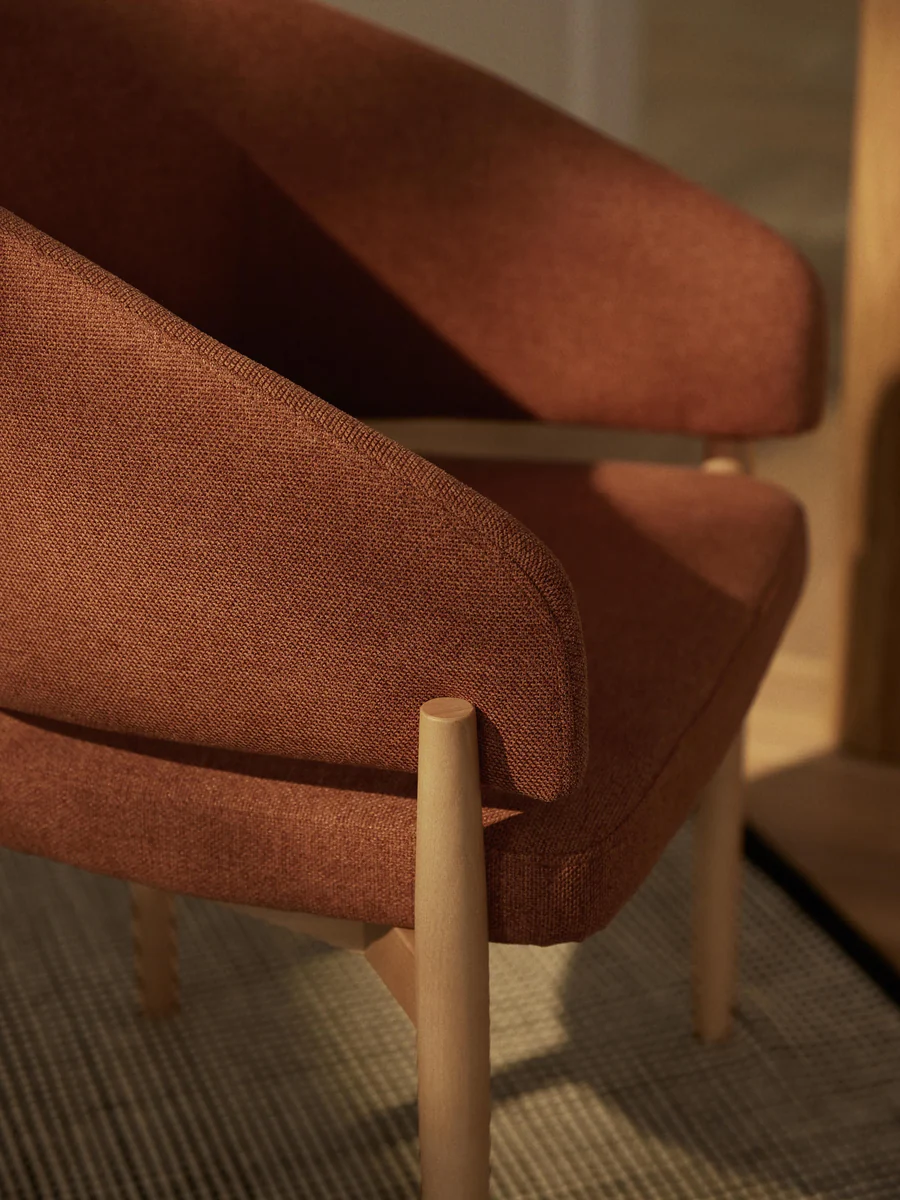 This upholstered armchair features a gently curved silhouette and padded seat for comfort. Its elegant legs and visible wood frame give it a stylish, timeless look.