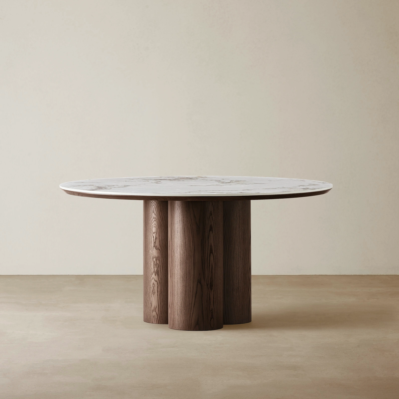 The Terzetto dining table features a luxurious sintered stone tabletop in a brown finish, showcasing rich marbled shades of rust-brown and grey. Supported by three dark brown ash wood legs, it combines warmth, stability, and modern elegance. Blending natural textures with engineered durability, this round table makes a refined centerpiece for any dining area.